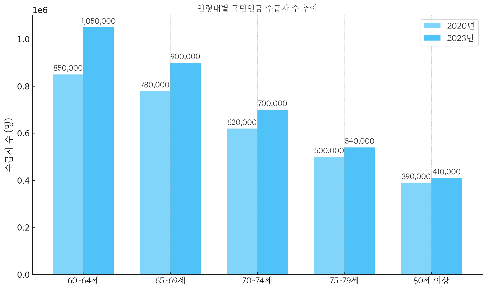 - 2020년 대비 2023년, 대부분 연령층에서 수급자 수가 눈에 띄게 증가했습니다.