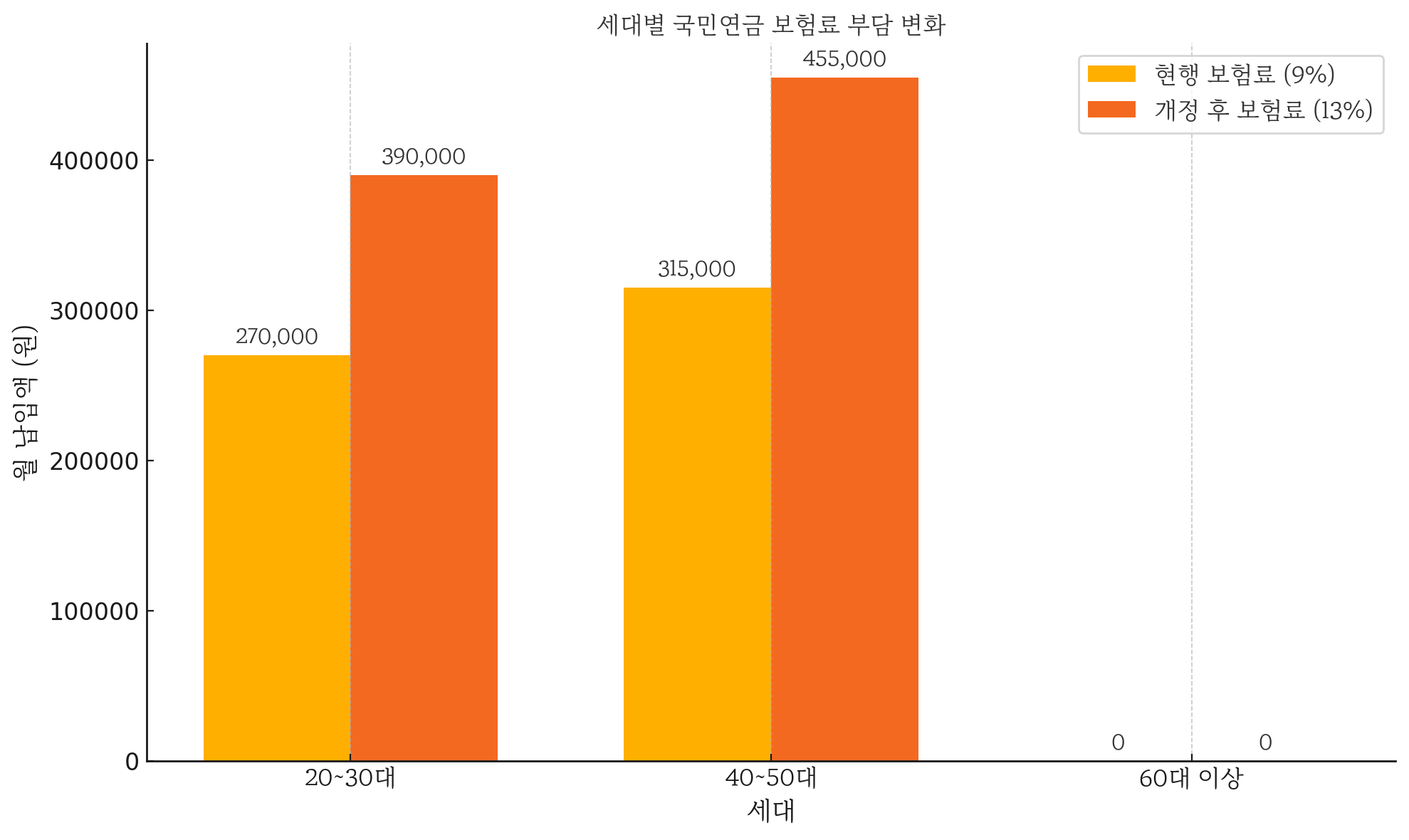 - 40~50대: 월 315,000원 → 455,000원으로 14만 원 증가